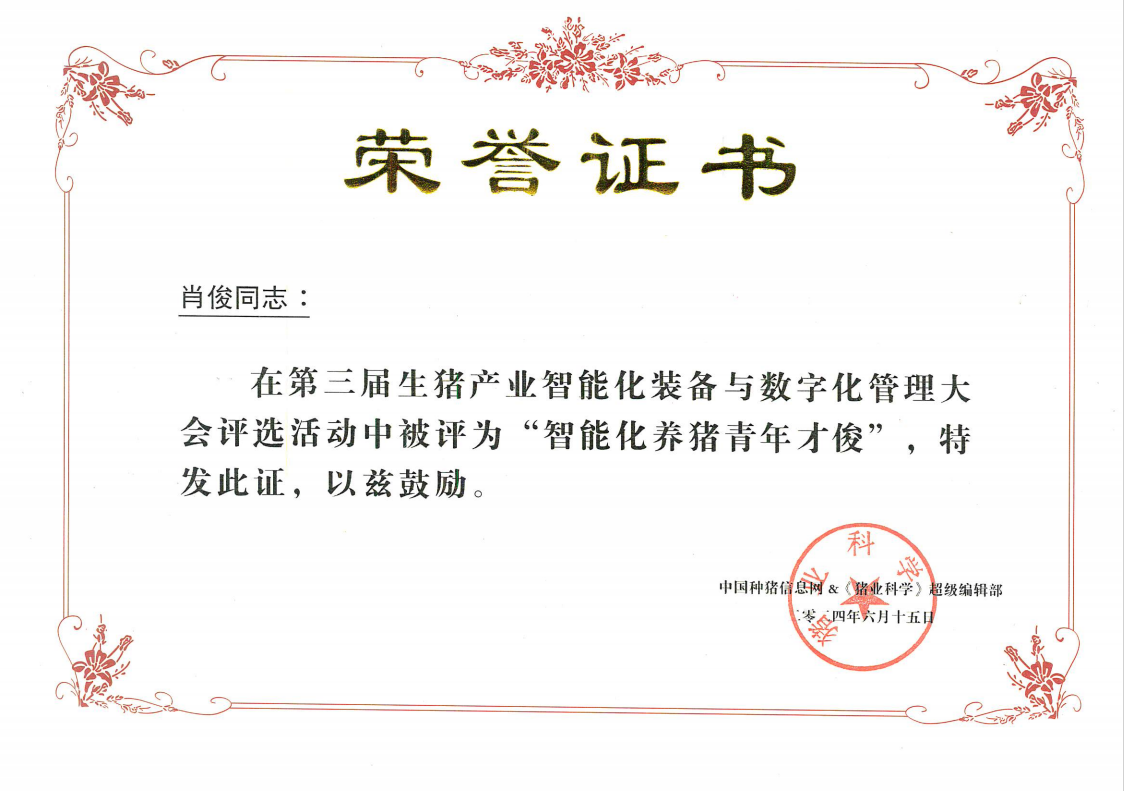 6月15日,由中国种猪信息网&《猪业科学》超级编辑部、中国畜牧兽医学会信息技术分会主办的第三届生猪产业智能化装备与数字化管理大会在河南南阳召开。69畜牧应邀参会并参与中国生猪产业智能化与数字化管理的学习和交流。会上,69畜牧获评“智能化养猪创新团队奖”,公司发展部副部长肖俊获评“智能化养猪青年才俊”荣誉称号。